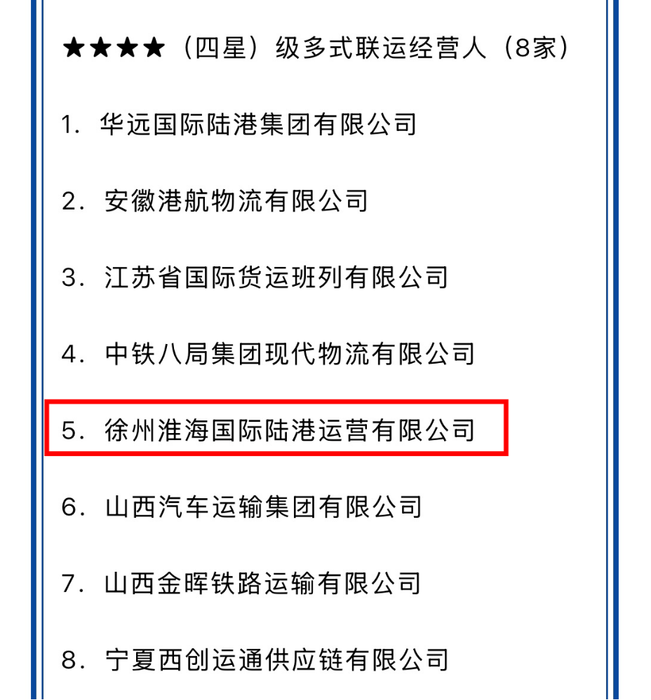 近日,中國集裝箱行業(yè)協(xié)會發(fā)布第四批多式聯(lián)運經(jīng)營人等級評估結(jié)果,歷經(jīng)資料審查、專家評審等多環(huán)節(jié)嚴(yán)格考核,徐州淮海國際陸港運營有限公司(以下簡稱“陸港集團運營公司”)憑借卓越的綜合實力和服務(wù)水平,成功獲評為“四星級多式聯(lián)運經(jīng)營人”。